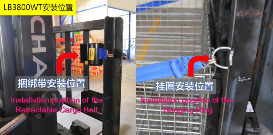 ● The binding strap is installed on the right side of the forklift guard rail frame (the right-hand side of the forklift driver).