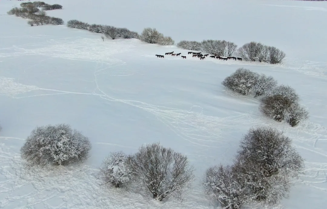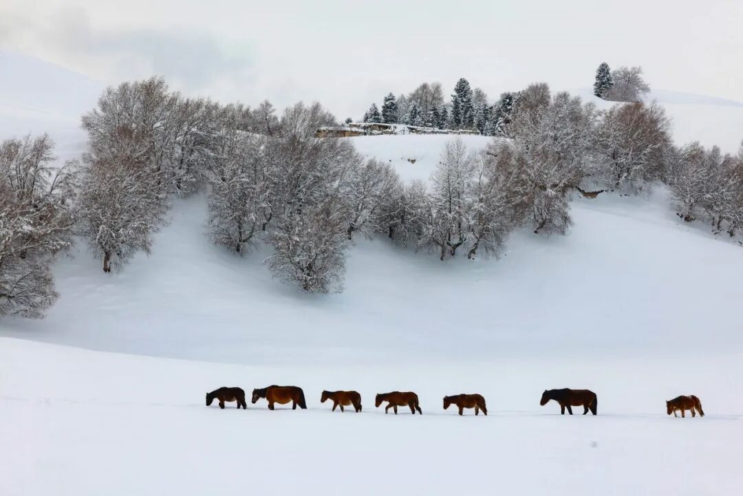 雪后的那拉提草原,茫茫天地被白雪盡數裹覆,無垠雪原如一幅靜謐水墨長卷。山間霧氣氤氳,與銀裝素裹相融,云杉、胡楊枝椏綴雪,挺拔蒼勁;雪地里牛馬悠然踱步,“冬窩子”靜臥其間,褪去喧囂,盡展冬日草原的遼闊與祥和。