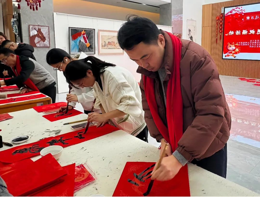 分享結束后,由揚州援疆書法家與新源本地書法骨干、文藝志愿者組成的“揚新同心書寫隊”即刻揮毫,書法家們凝神聚氣,提筆、蘸墨、運筆一氣呵成,隸書的莊重、行書的流暢、草書的靈動在紅紙上綻放,“揚新同心謀發展墨香傳福賀新春”等一幅幅春聯躍然紙上,墨香中滿是家國情懷與團結期盼,現場群眾、青少年代表圍在一旁觀摩學習,沉浸式感受傳統文化魅力。