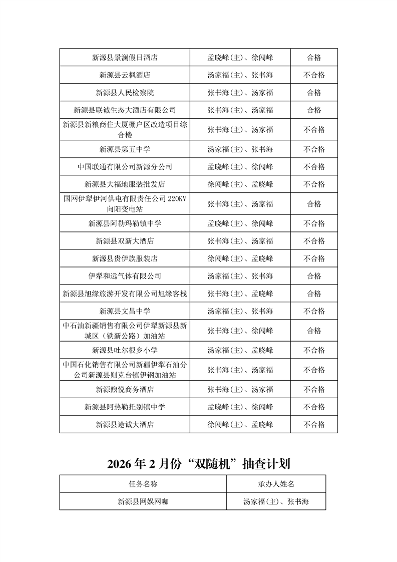 新源縣消防救援大隊2026年1月份“雙隨機”檢查結果及2月份“雙隨機”抽查計劃