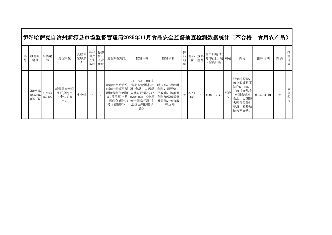 伊犁哈薩克自治州新源縣市場監督管理局2025年11月食品安全監督抽查檢測數據統計(不合格 食用農產品)