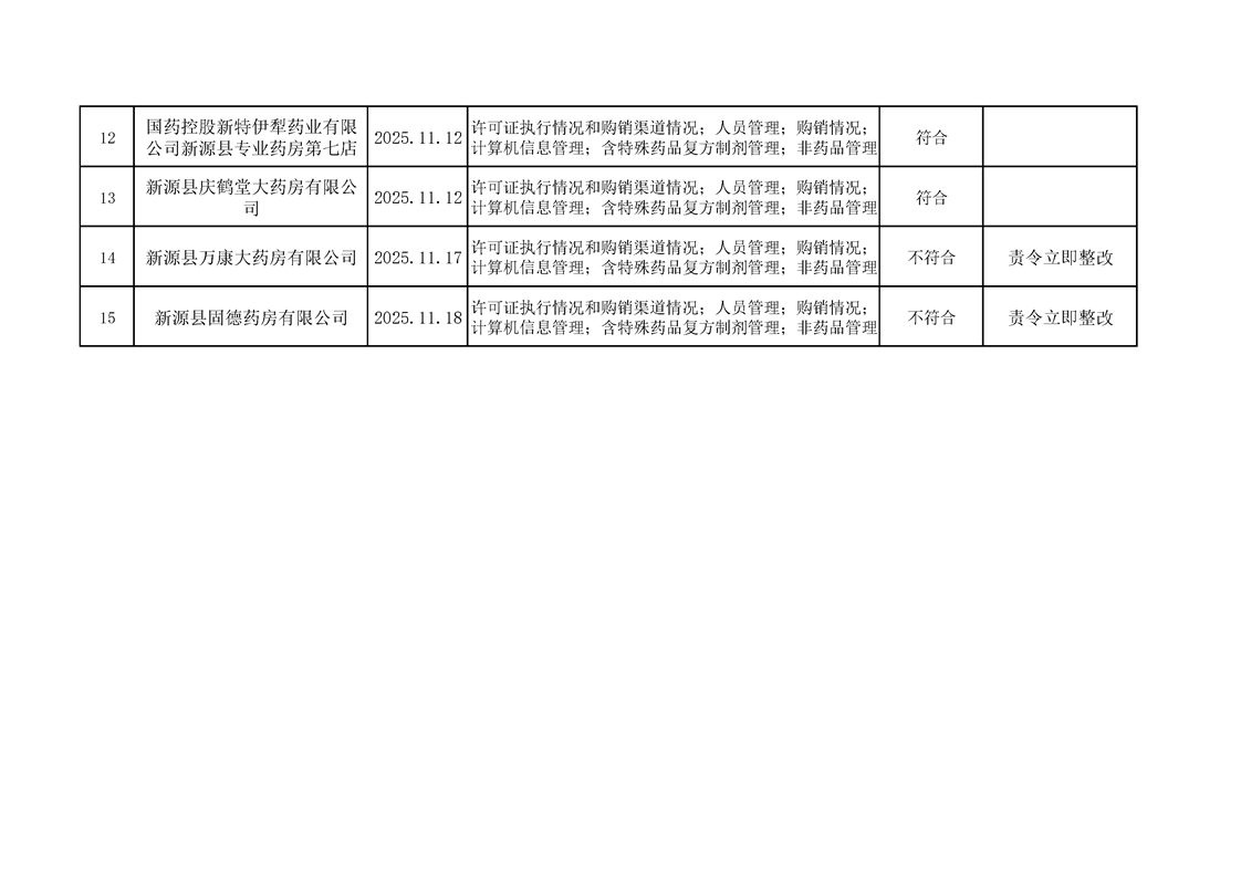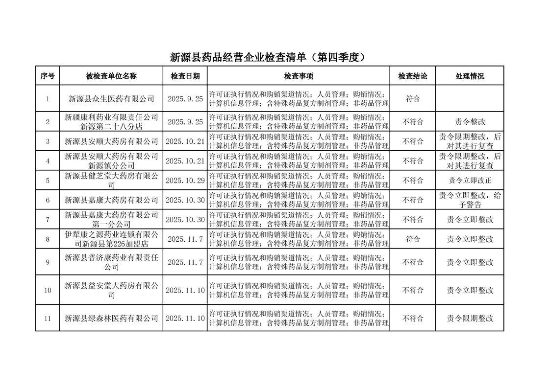 新源縣2025年度藥品經營企業檢查清單(第四季度)