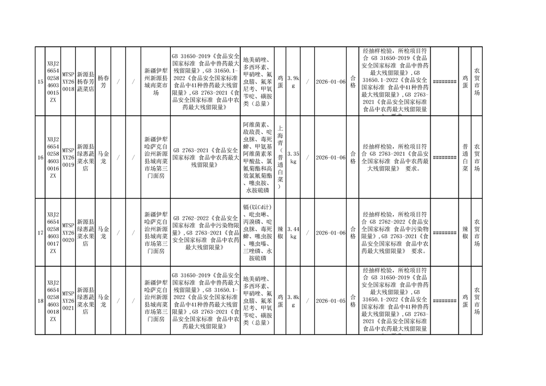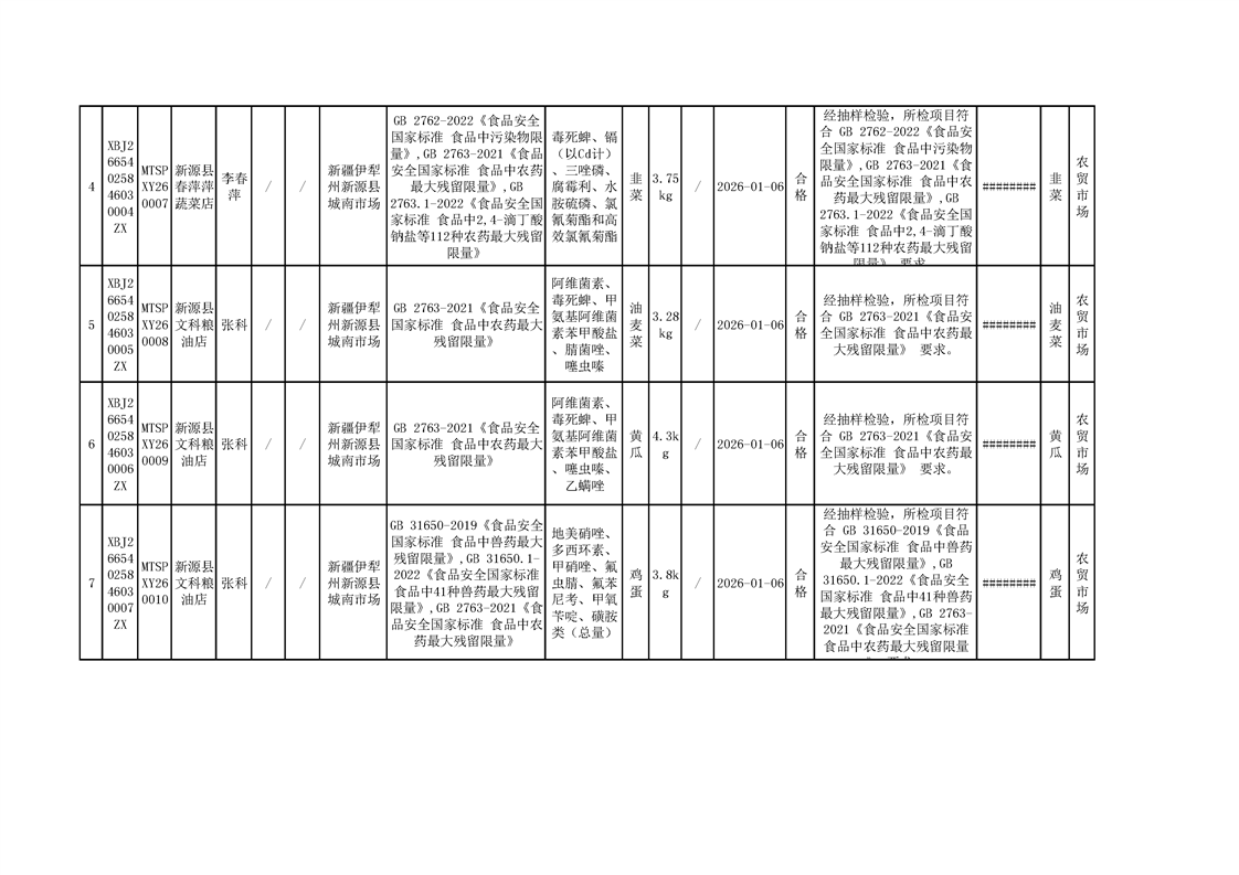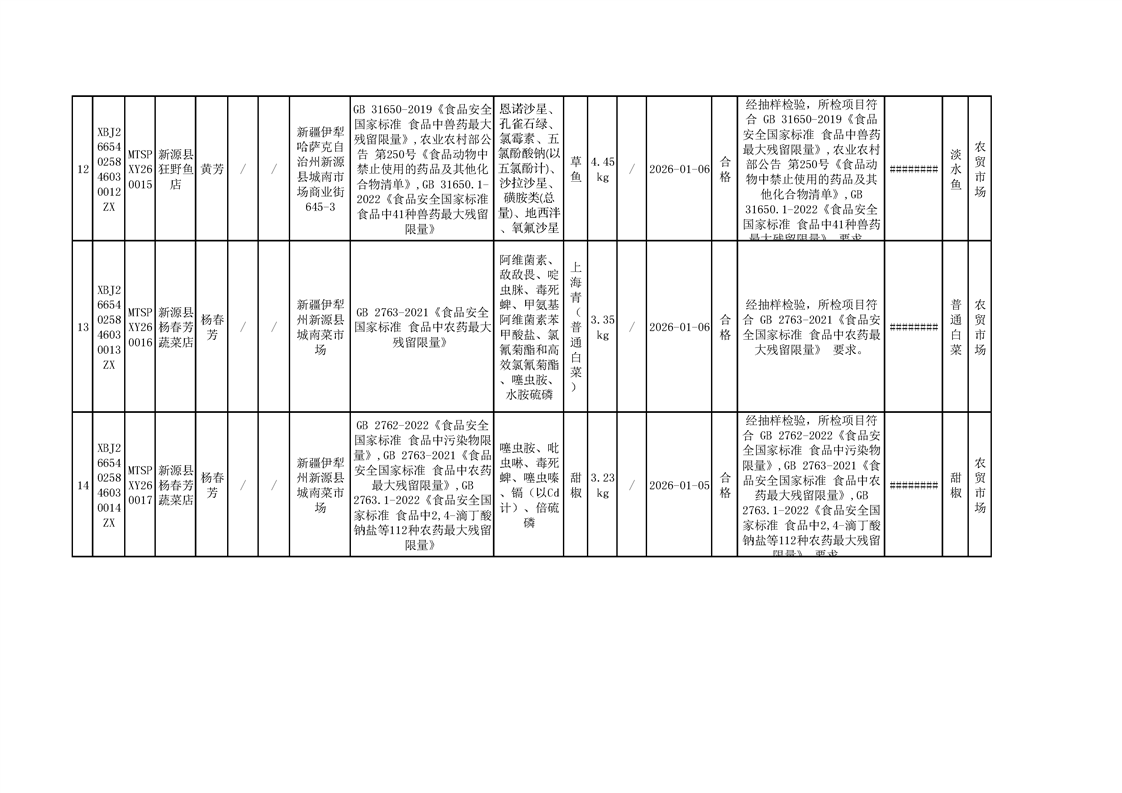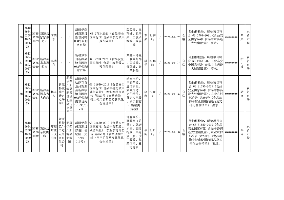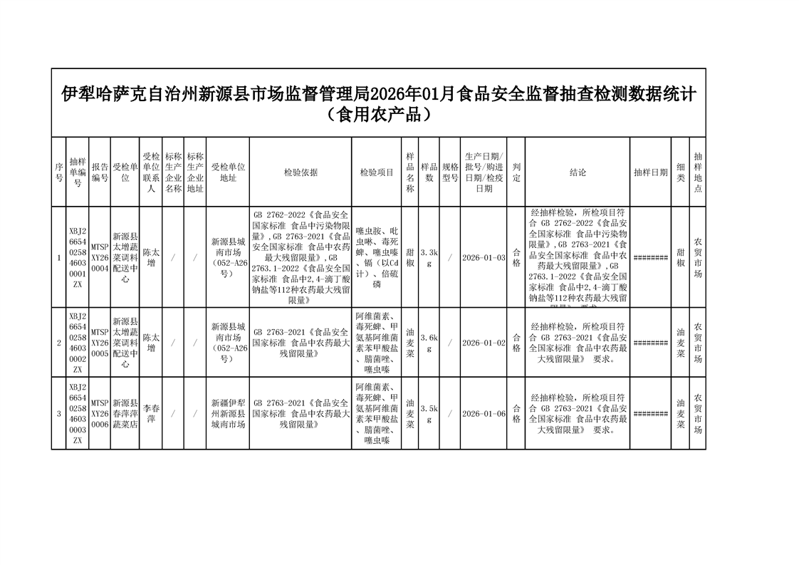 伊犁哈薩克自治州新源縣市場監督管理局2026年01月食品安全監督抽查檢測數據統計(食用農產品)
