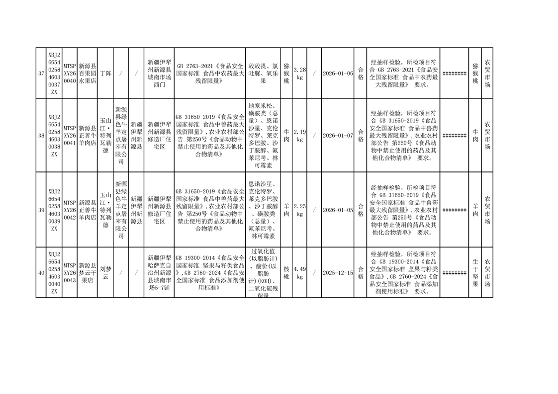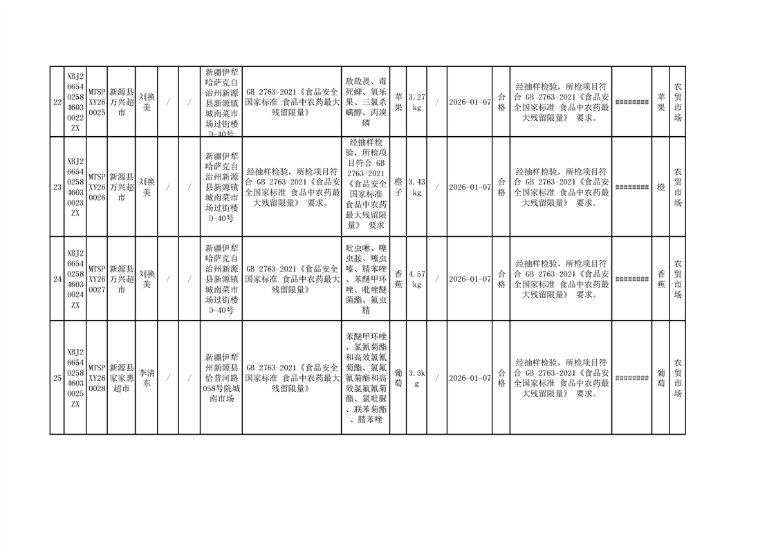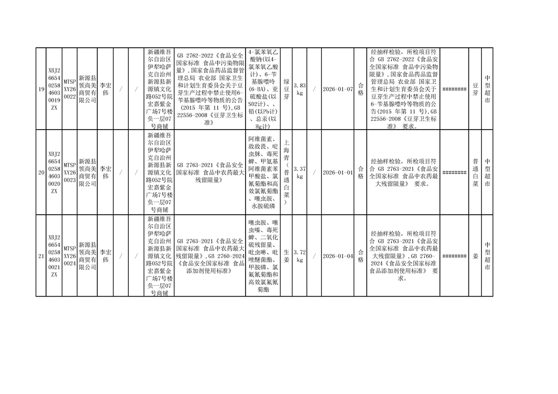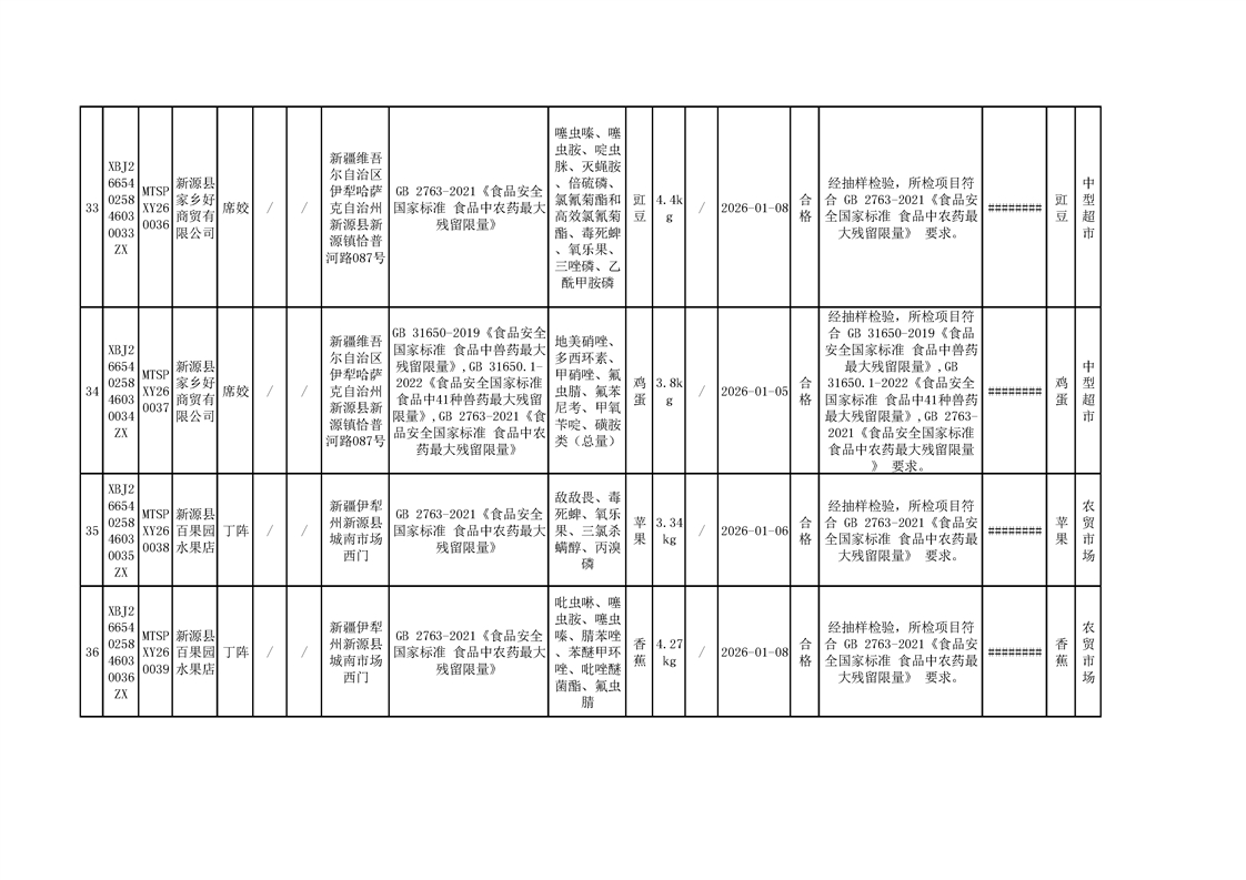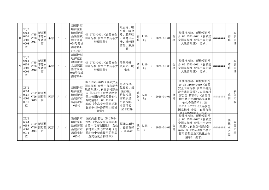 伊犁哈薩克自治州新源縣市場監督管理局2026年01月食品安全監督抽查檢測數據統計(食用農產品)