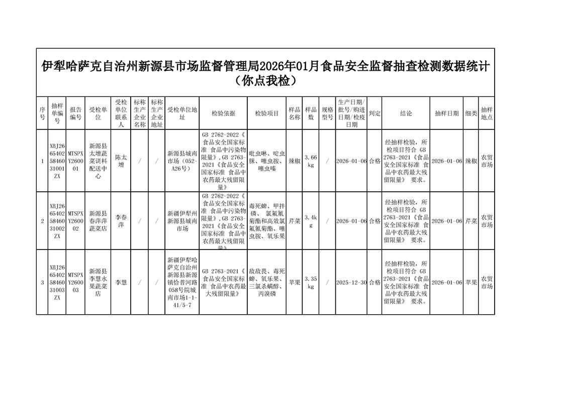 伊犁哈薩克自治州新源縣市場監(jiān)督管理局2026年01月食品安全監(jiān)督抽查檢測數(shù)據(jù)統(tǒng)計(jì)(你點(diǎn)我檢)