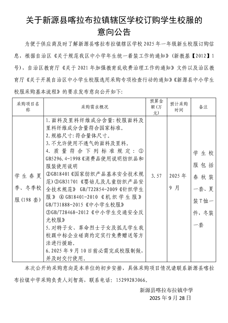 關于新源縣喀拉布拉鎮轄區學校訂購學生校服的意向公告