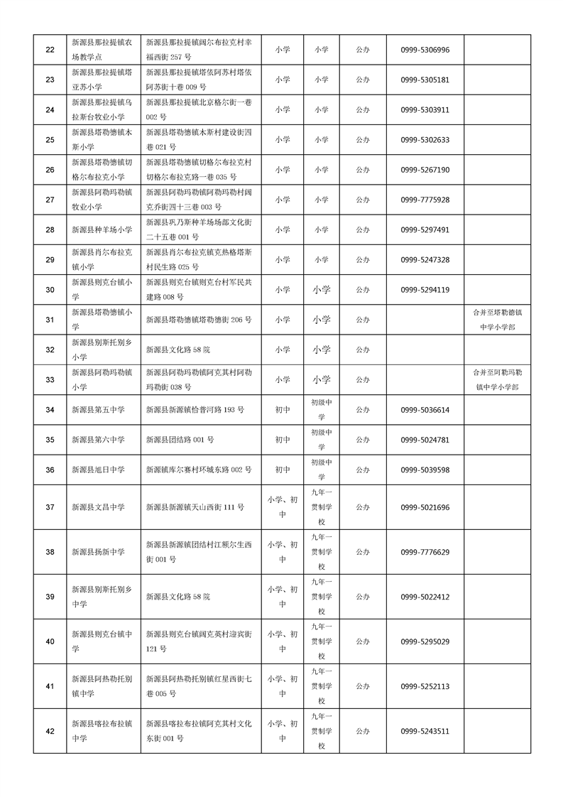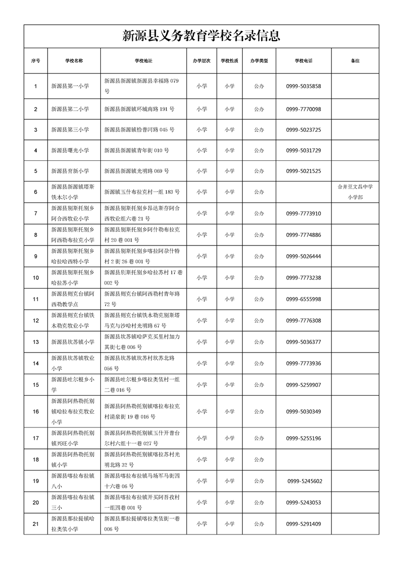 新源縣義務教育學校名錄信息