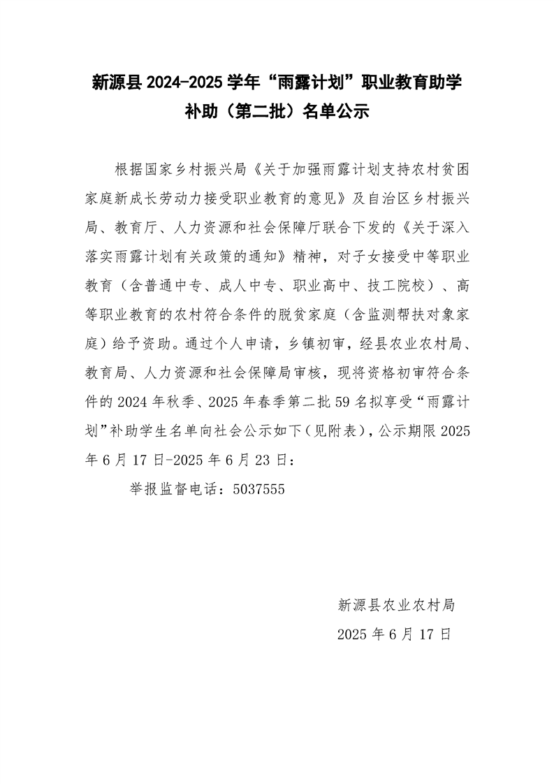 新源縣2024-2025學年“雨露計劃”職業教育助學補助(第二批)名單公示