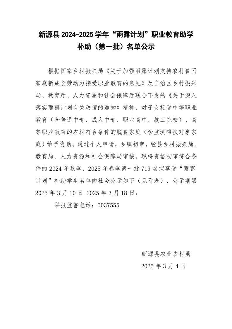 新源縣2024-2025學年“雨露計劃”職業教育助學補助(第一批)名單公示