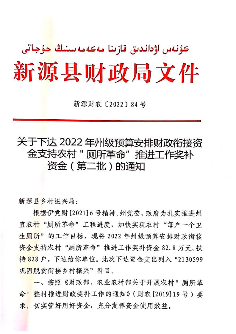 新源財農【2022】84號關于下達2022年州級預算安排財政銜接資金支持農村"廁所革命”推進工作獎補資金(第二批)的通知