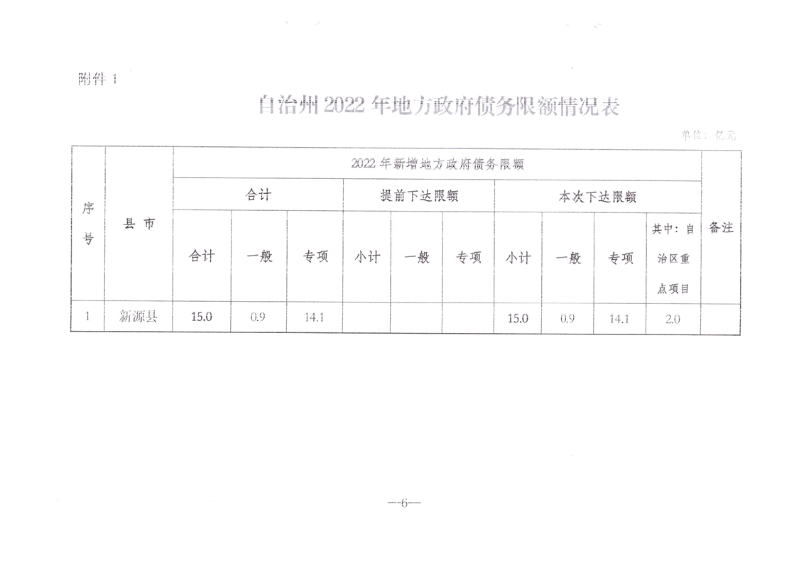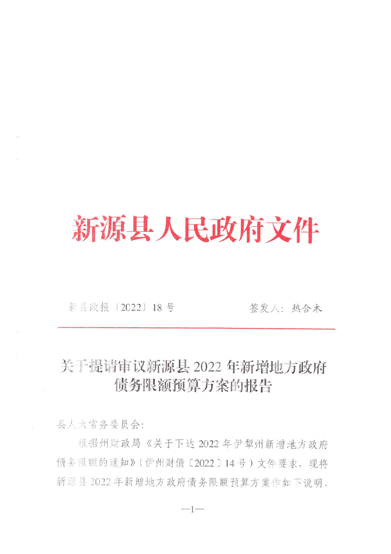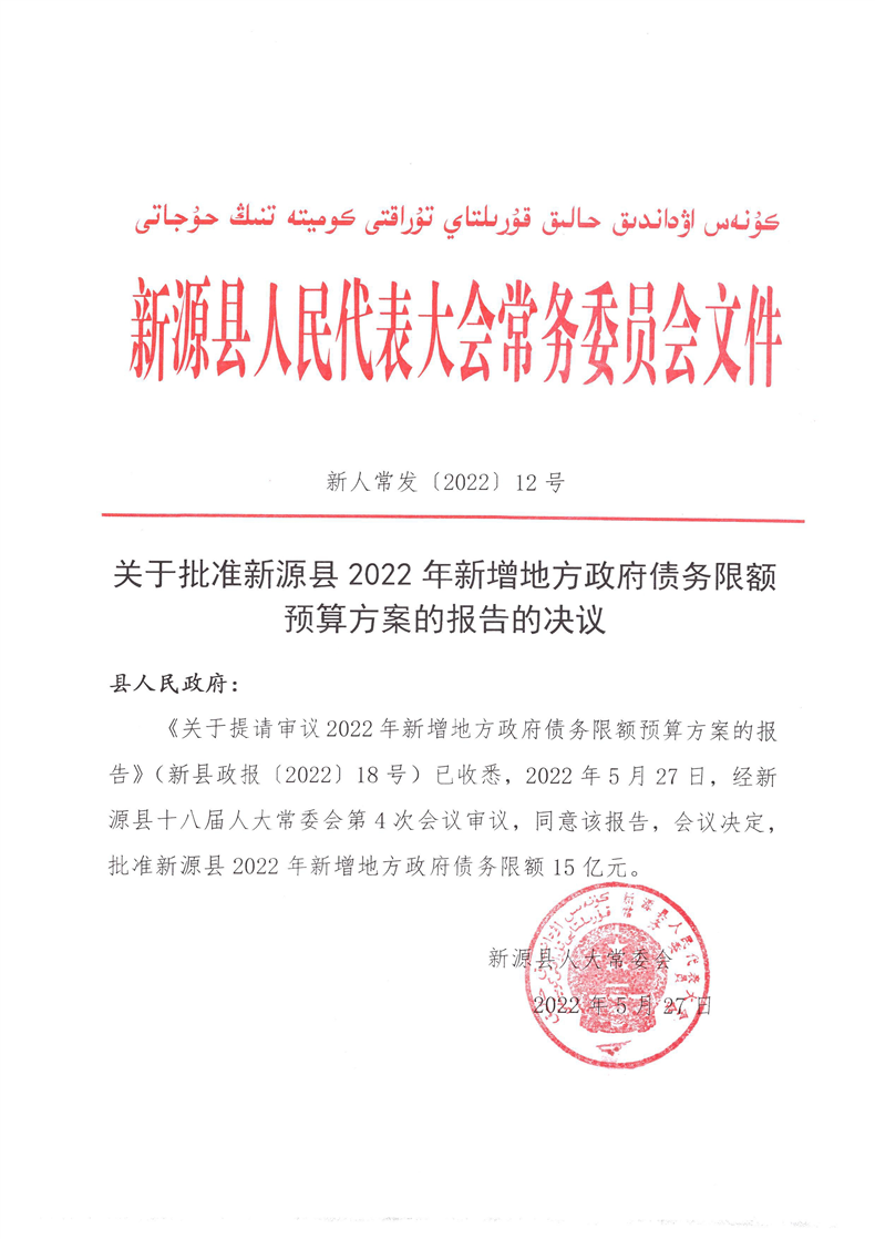 關于批準新源縣2022年新增地方政府債務限額預算方案的報告的決議