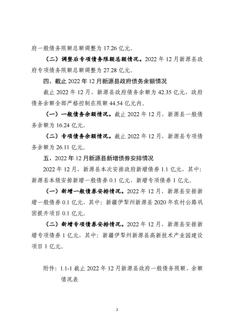 截至2022年12月新源縣政府債務預算調整情況說明及附表