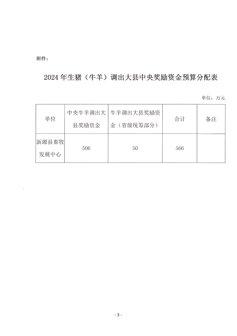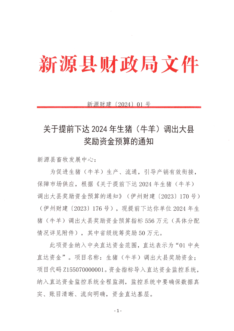 新源財建[2024]001號 關于提前下達2024年生豬(牛羊)調出大縣獎勵資金預算的通知