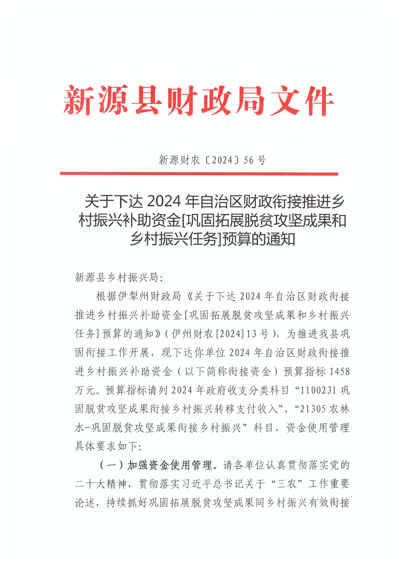 新源財農[2024]56號關于下達2024年自治區財政銜接推進鄉村振興補助資金[鞏固拓展脫貧攻堅成果和鄉村振興任務]預算的通知