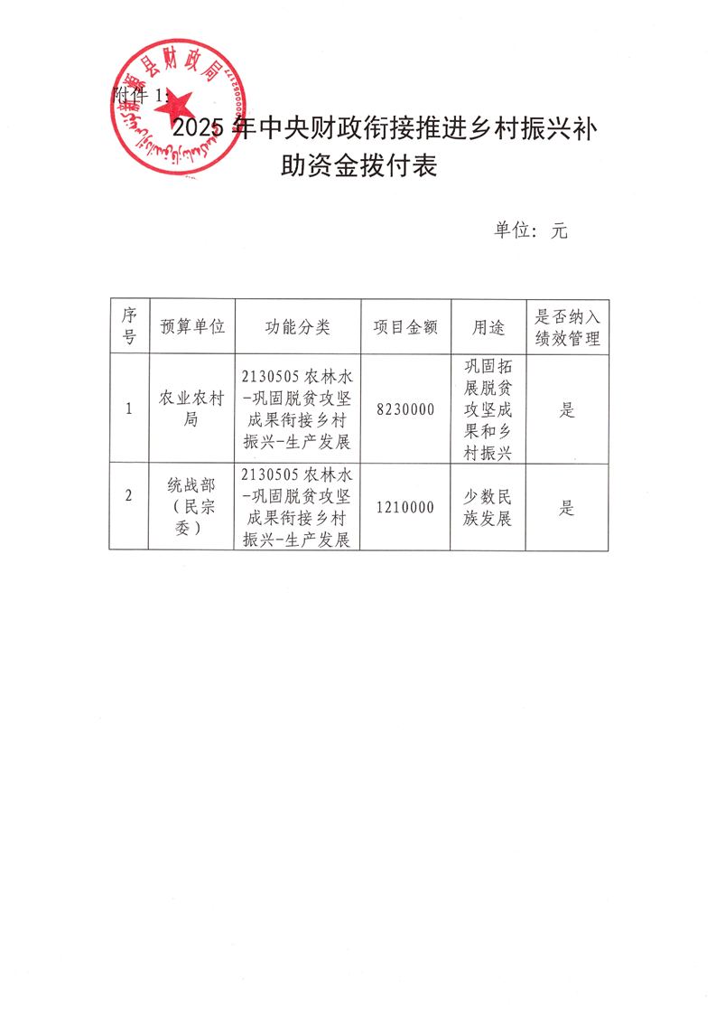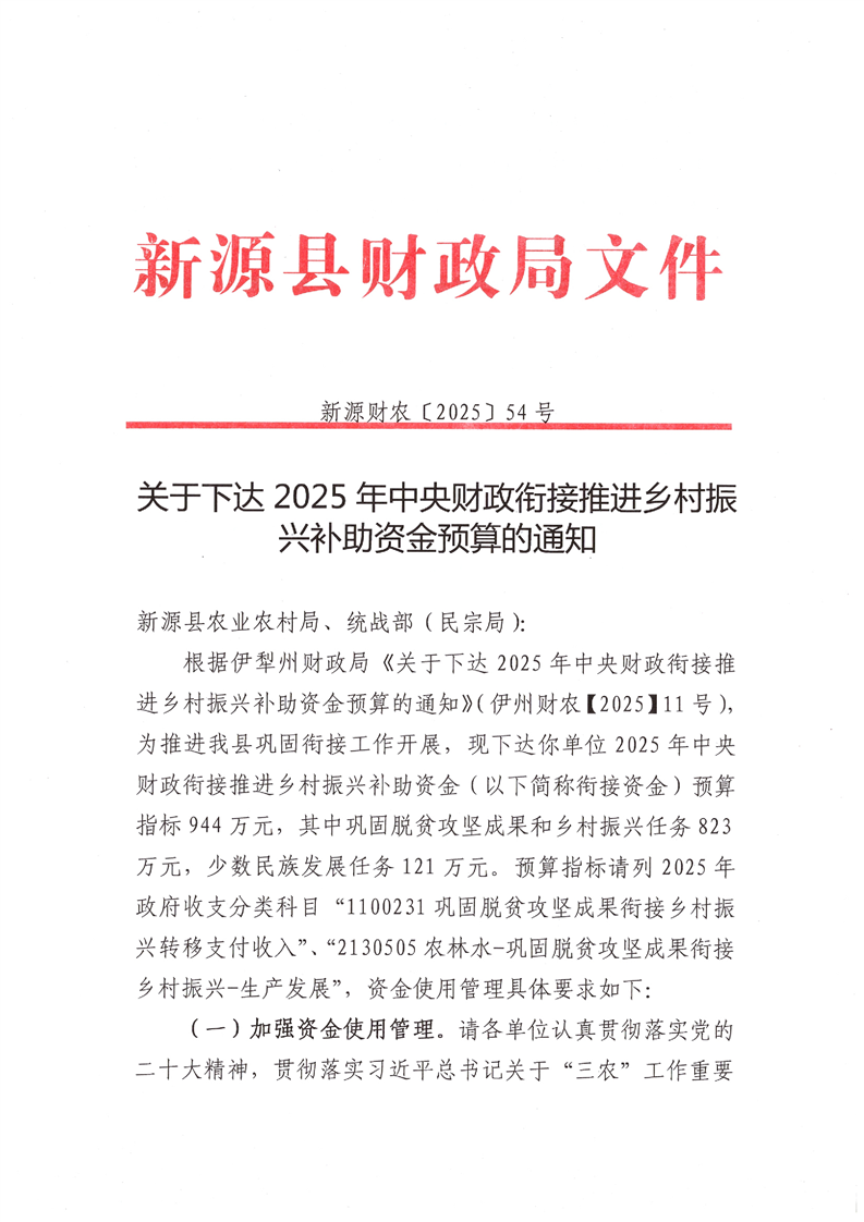 關(guān)于下達(dá)2025年中央財(cái)政銜接推進(jìn)鄉(xiāng)村振興補(bǔ)助資金預(yù)算的通知