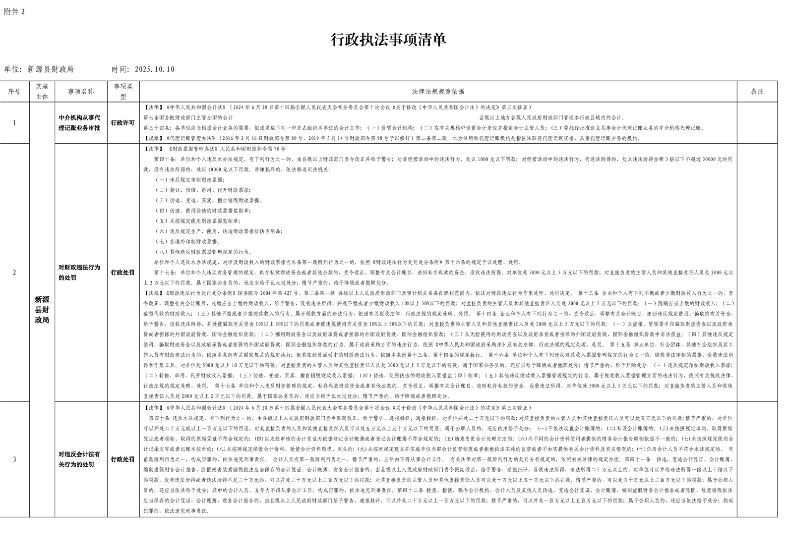 新源縣財政局行政執法事項清單