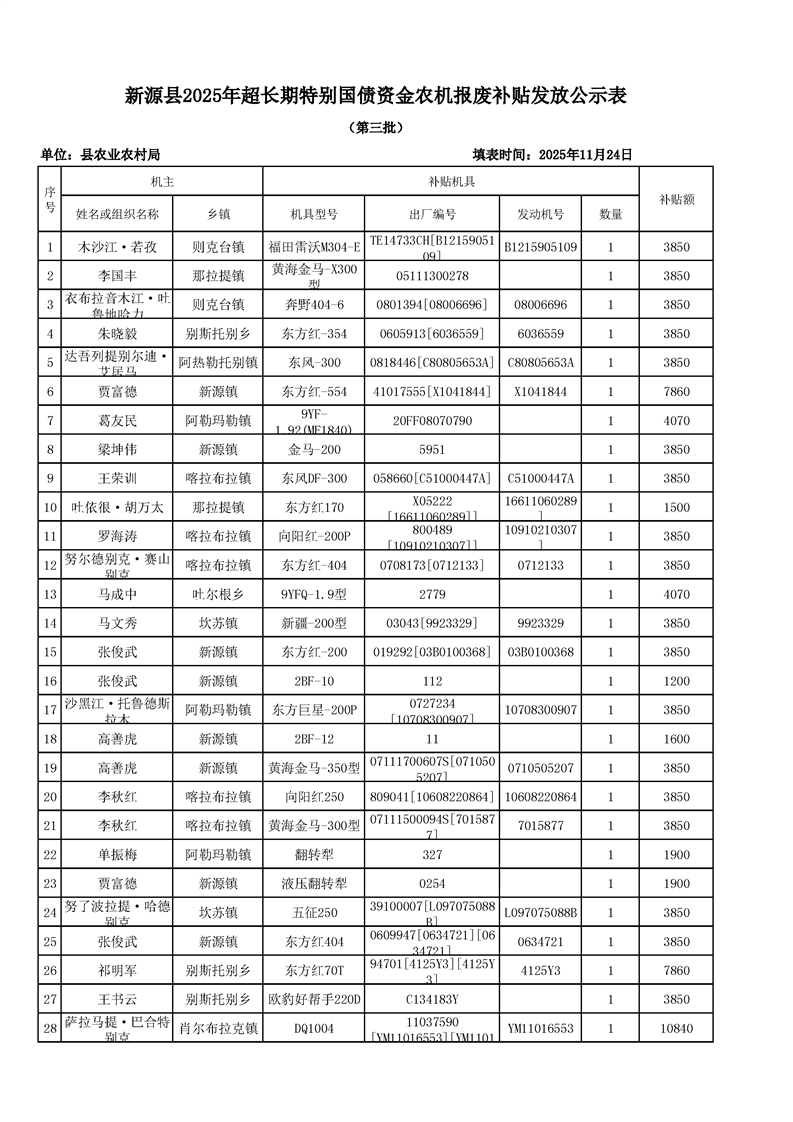 新源縣2025年超長期特別國債資金農機報廢補貼發放公示(第三批)