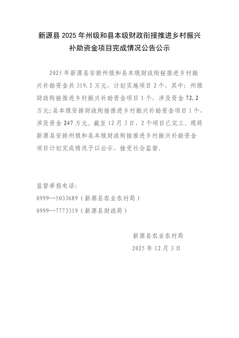 新源縣2025年州級(jí)和縣本級(jí)財(cái)政銜接推進(jìn)鄉(xiāng)村振興補(bǔ)助資金項(xiàng)目完成情況公告公示