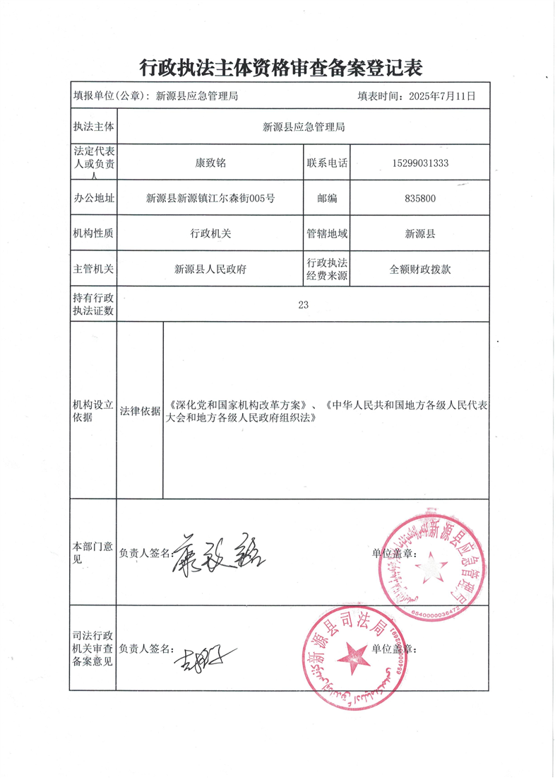 新源縣應急管理局行政執(zhí)法主題資格審查備案登記表