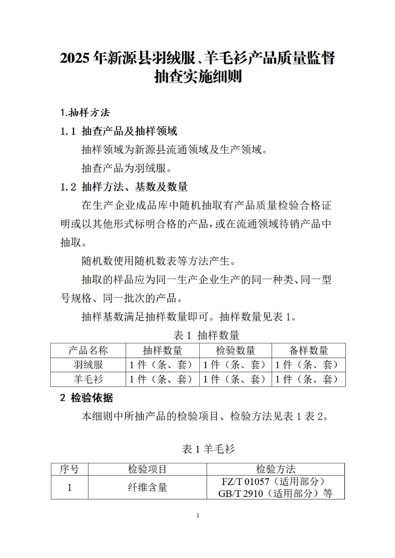 2025年新源縣羽絨服、羊毛衫產(chǎn)品質(zhì)量監(jiān)督抽查實施細則