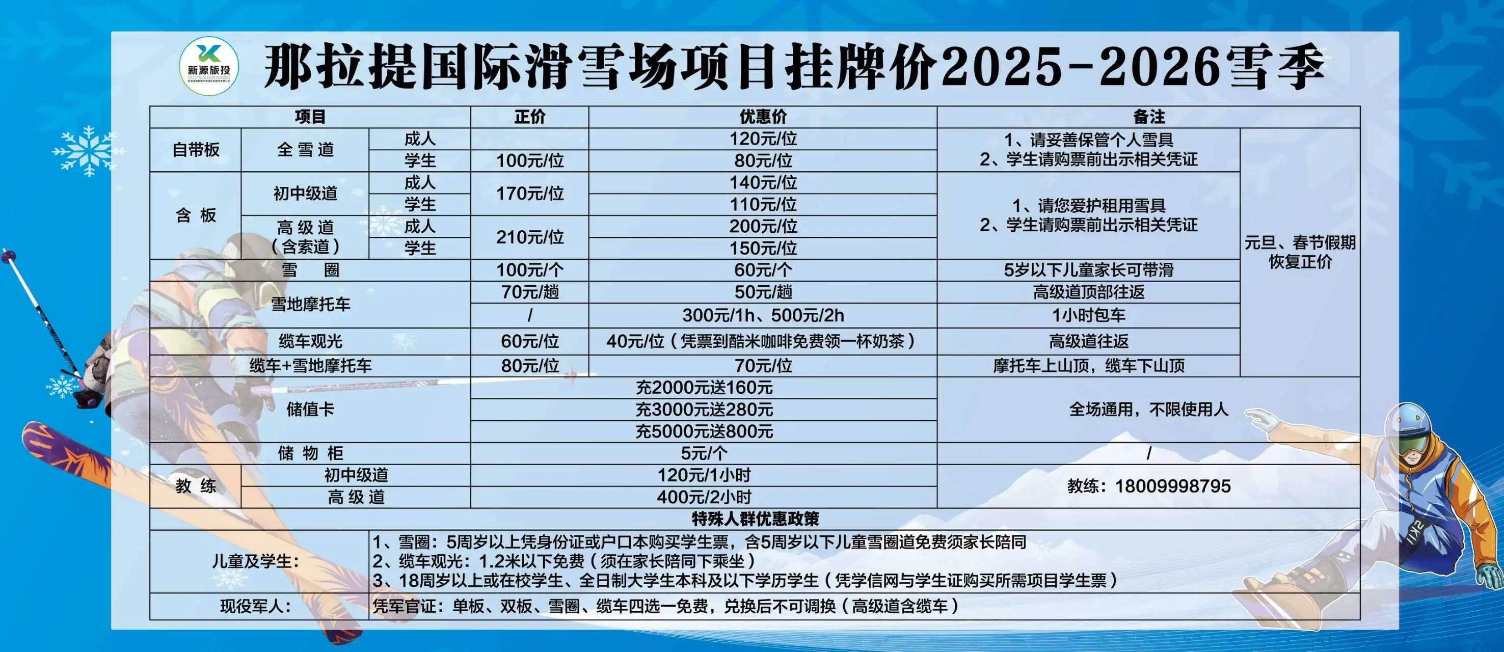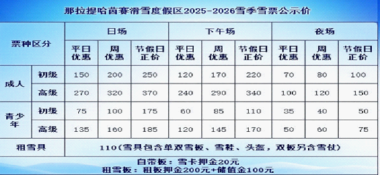 2025-2026雪季,所有游客均可享受以下酒店 滑雪套餐優惠,雪票均為那拉提國際滑雪場,含雪板;賓館至雪場免費往返接送。